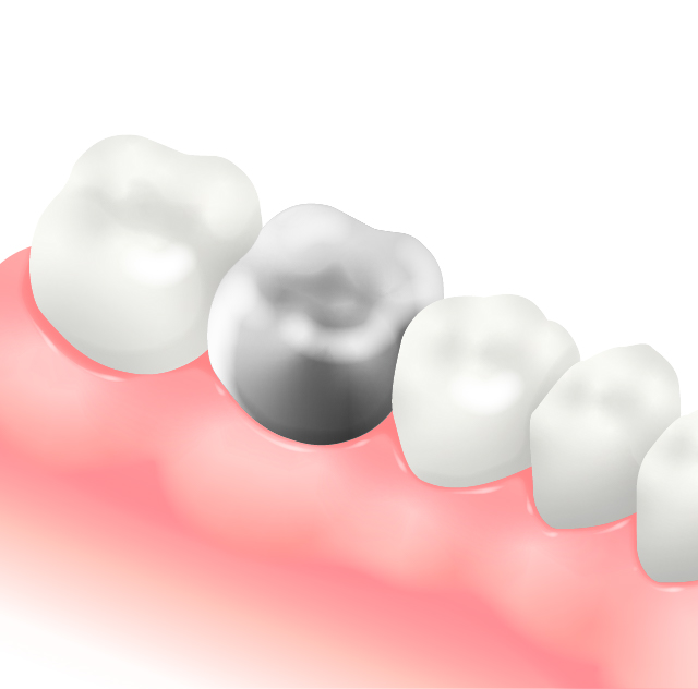 冠全体が金属でできている、いわゆる「銀歯」です。保険診療で奥歯(基本的に前から4番目以降の歯)にクラウンを装着する場合、すべてこのメタルクラウン(銀歯)となります。