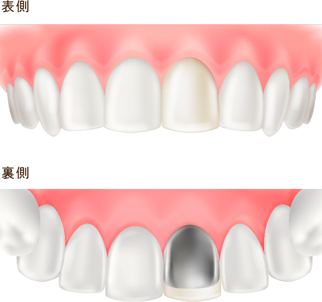 ジルコニアセラミッククラウンとは、内側をジルコニア(セラミック素材の一種)、外側をセラミックで作製した、すべてセラミック素材のクラウンです。メタルボンドと異なり、金属を一切使用しないため、金属の溶け出しによる歯ぐきの変色や金属アレルギーなどの心配がありません。強度も高いため、奥歯やブリッジに使用することも可能です。