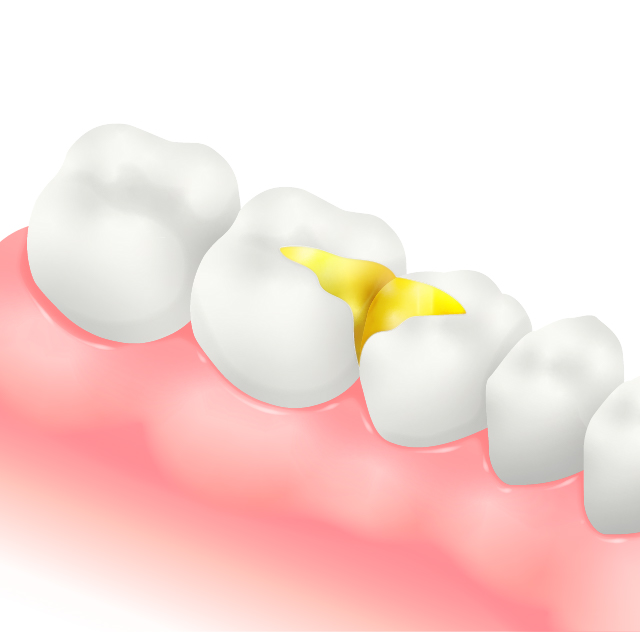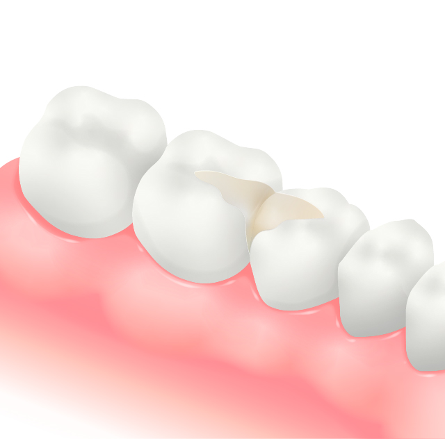 軽度のむし歯などで歯を少しだけ削ったあとに入れて治療するのが詰め物(インレー)です。歯の一部分だけを補うので、歯の土台を形成する必要はありません。主に臼歯に行います。