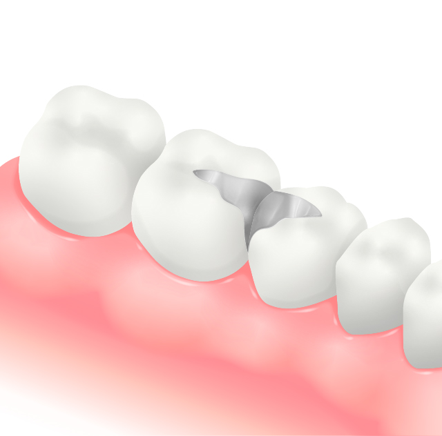 奥歯の詰め物に用いられる銀色のインレーで、金銀パラジウム合金という金属が使用されます。
